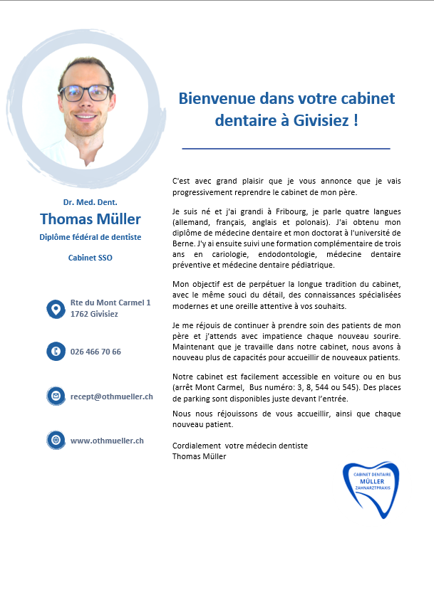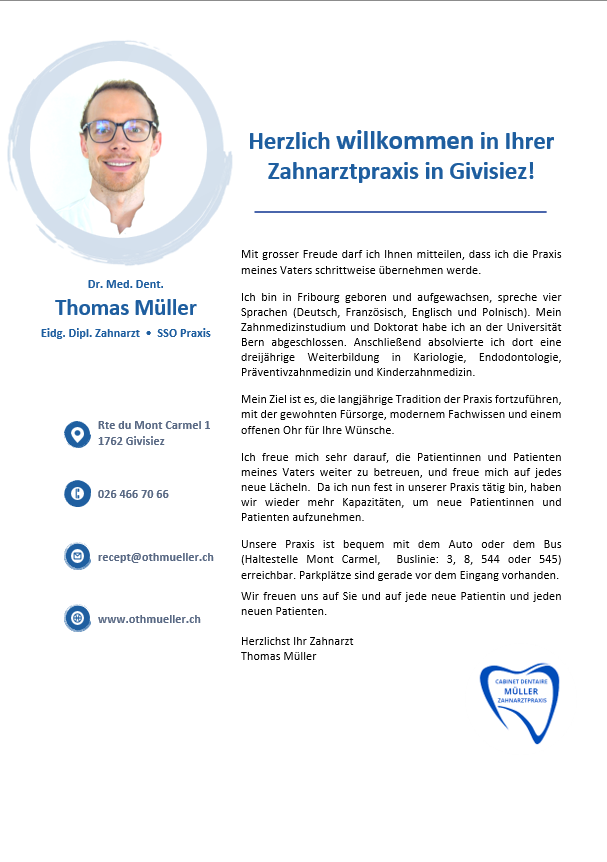 Otto Th. MüllerEidg. Dipl. Zahnarzt Tel.: 026 466 70 66 E-Mail: recept@othmueller.ch |